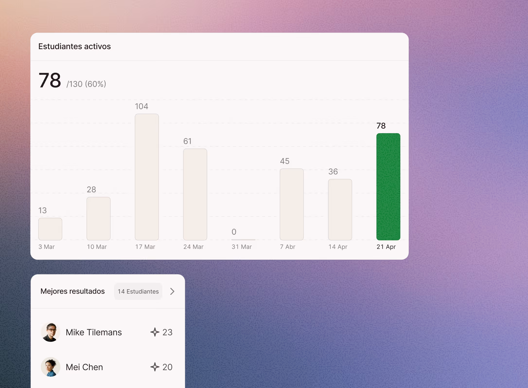 Con nuestra plataforma, el desarrollo en IA de tu equipo se vuelve medible, con insights clave para los líderes de la organización.